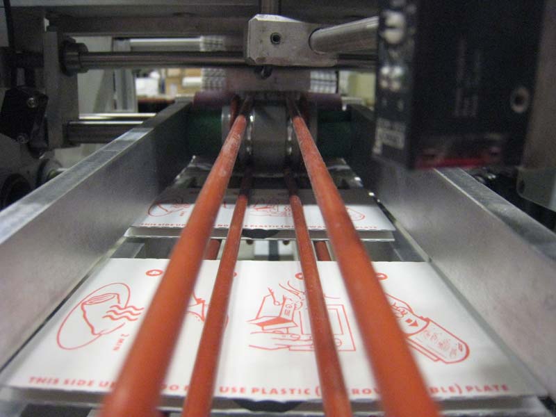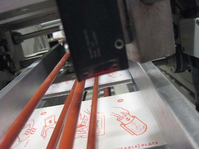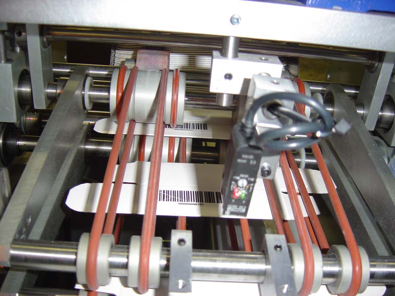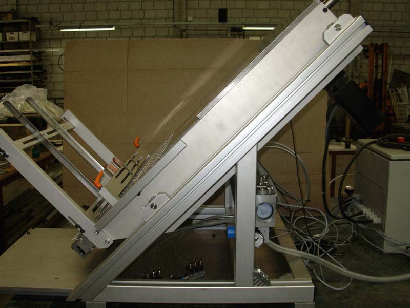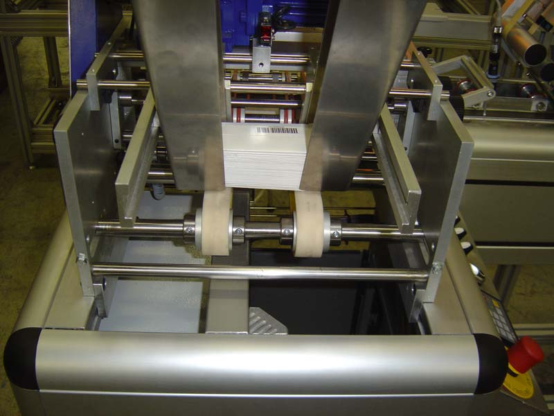 Deze machine is ontwikkeld door een klant en door Lakens Metaal gefabriceerd. Een booklet wordt onder een stapel vandaan gehaald d.m.v. een vacuüm en op een papierbaan gepositioneerd. Precisie is essentieel; de booklet dient op de juiste plaats te liggen zodat het pas komt met de bedrukking.